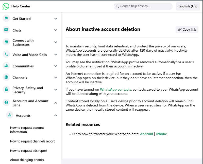 ಬಳಕೆದಾರರ ಗೌಪ್ಯತೆಯನ್ನು ಹೆಚ್ಚಿಸಲು ಡೇಟಾ ಸಂಗ್ರಹಣೆಯನ್ನು ಉತ್ತಮವಾಗಿ ನಿರ್ವಹಿಸಲು ಮತ್ತು -ಪ್ಲಾಟ್ಫಾರ್ಮ್ನಲ್ಲಿ ಸುರಕ್ಷತೆಯನ್ನು ಕಾಪಾಡಿಕೊಳ್ಳಲು ಈ ನೀತಿಯನ್ನು ವಿನ್ಯಾಸಗೊಳಿಸಲಾಗಿದೆ. ಆದಾಗ್ಯೂ ಸಾಧನದಲ್ಲಿ ಸ್ಥಳೀಯವಾಗಿ ಸಂಗ್ರಹವಾಗಿರುವ ಡೇಟಾ WhatsApp ಅನ್ನು ಅಸ್ಥಾಪಿಸುವವರೆಗೆ ಉಳಿಯುತ್ತದೆ. ಬಳಕೆದಾರರು ಅದೇ ಸಂಖ್ಯೆ ಮತ್ತು ಸಾಧನವನ್ನು ಬಳಸಿಕೊಂಡು WhatsApp ಅನ್ನು ಮರುಸಕ್ರಿಯಗೊಳಿಸಿದರೆ ಸಂಗ್ರಹಿಸಿದ ಡೇಟಾವನ್ನು ಹಿಂಪಡೆಯಬಹುದು.