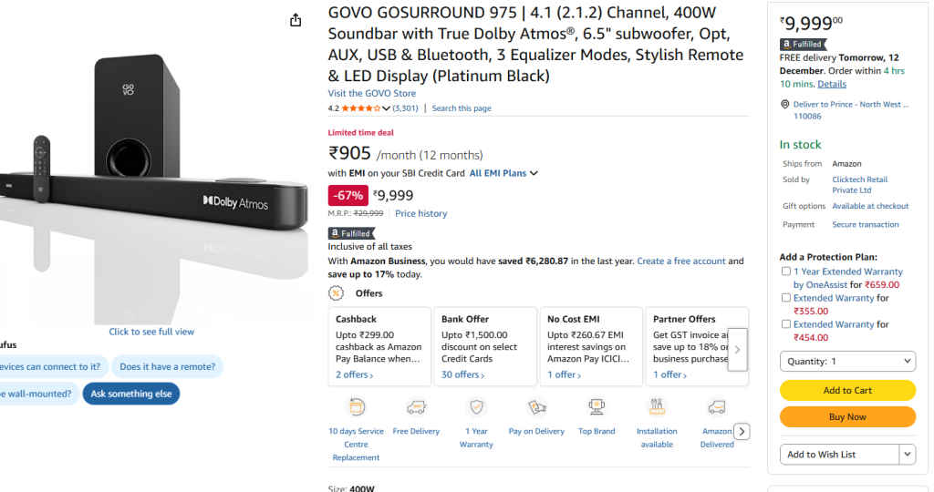 ಅಮೆಜಾನ್ ಸೇಲ್ನಲ್ಲಿ ಇಂದು ಸುಮಾರು ₹9,999 ರೂಗಳಿಗೆ Govo ಕಂಪನಿಯ ಸೌಂಡ್ಬಾರ್ ಲಭ್ಯ.