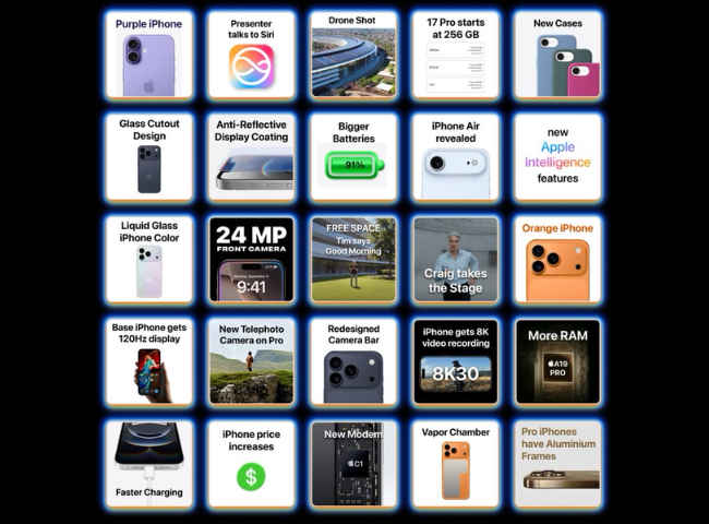 ಆಪಲ್ ಈ ಬಾರಿ ತನ್ನ iPhone 17 ಸರಣಿಯನ್ನು ಬಿಡುಗಡೆ ಮಾಡುವ ಸಾಧ್ಯತೆ ಹೆಚ್ಚು. ಇದರಲ್ಲಿದೆ iPhone 17, 17 Pro, 17 Pro Max ಮತ್ತು ವಿಶೇಷವಾಗಿ ಅತಿ ತೆಳುವಾದ iPhone 17 Air (ಸುಮಾರು 5.5mm). ಹೊಸ 24MP ಫ್ರಂಟ್ ಕ್ಯಾಮೆರಾ, Pro ಮಾದರಿಗಳಲ್ಲಿ 48MP ಟೆಲಿಫೋಟೋ ಲೆನ್ಸ್, 8x ಆಪ್ಟಿಕಲ್ ಜೂಮ್, ಮತ್ತು ಹೊಸ iOS 26 ಪರಿಚಯವಾಗಲಿದೆ. ಜೊತೆಗೆ Apple Watch Series 11, Watch Ultra 3 (ಸಾಟಲೈಟ್ ಸಂಪರ್ಕ), ಹಾಗೂ AirPods Pro 3 (ಹೃದಯ ಬಡಿತ ಮಾಪನ) ಕೂಡ ಬರಬಹುದು. macOS Tahoe ಮತ್ತು ಹೊಸ Apple TV/ಹೋಮ್ಪಾಡ್ ಉತ್ಪನ್ನಗಳು ಘೋಷಣೆಗೊಳ್ಳುವ ಸಾಧ್ಯತೆ ಇದೆ. ಈವೆಂಟ್ನಲ್ಲಿ ಬಣ್ಣದ ಹೊಸ ಆಯ್ಕೆಗಳು ಮತ್ತು ವಿಶೇಷ AI ಫೀಚರ್ಗಳೂ ಇರಬಹುದು.