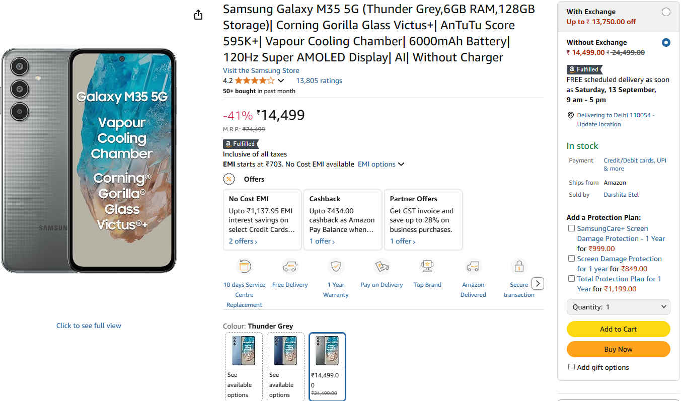 Samsung Galaxy M35 5G ಸ್ಮಾರ್ಟ್ ಫೋನ್ ₹14,499 ರೂಗಳಿಗೆ ಪಟ್ಟಿ ಮಾಡಿ ಮಾರಾಟ ಮಾಡುತ್ತಿದೆ.