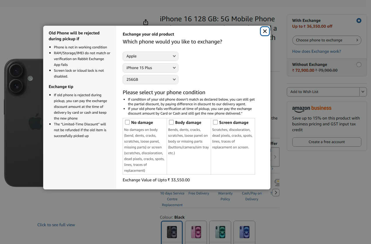 ಐಫೋನ್ 16 (128GB, ಕಪ್ಪು) ಪ್ರಸ್ತುತ ಅಮೆಜಾನ್ ಇಂಡಿಯಾದಲ್ಲಿ ಅದರ ಮೂಲ ಬೆಲೆ ರೂ. 79,000 ಕ್ಕೆ ಪಟ್ಟಿ ಮಾಡಲಾಗಿದೆ. ಆದಾಗ್ಯೂ 9% ರಷ್ಟು ರಿಯಾಯಿತಿಯು ಬೆಲೆಯನ್ನು ರೂ. 72,900 ಕ್ಕೆ ಇಳಿಸುತ್ತದೆ. ಖರೀದಿದಾರರು ಅಮೆಜಾನ್ ವಿನಿಮಯ ಕಾರ್ಯಕ್ರಮದ ಲಾಭವನ್ನು ಪಡೆಯುವ ಮೂಲಕ ಇನ್ನೂ ಹೆಚ್ಚಿನದನ್ನು ಉಳಿಸಬಹುದು. ಉದಾಹರಣೆಗೆ ಉತ್ತಮ ಸ್ಥಿತಿಯಲ್ಲಿರುವ iPhone 15 Plus (256GB) ಅನ್ನು ವಿನಿಮಯ ಮಾಡುವುದರಿಂದ ಇದರ ಮೌಲ್ಯದಲ್ಲಿ ರೂ. 33,550 ವರೆಗೆ ಪಡೆಯಬಹುದು.
