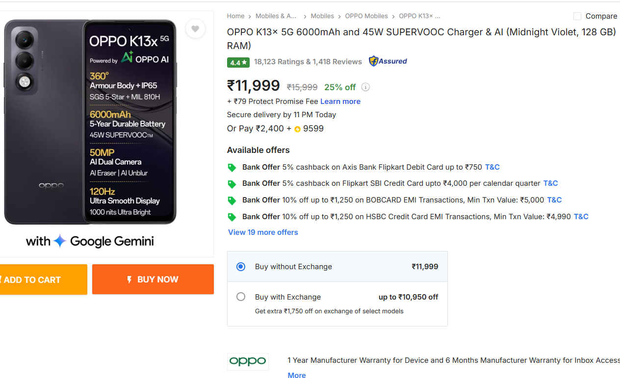OPPO K13x 5G ಸ್ಮಾರ್ಟ್ಫೋನ್ ಫ್ಲಿಪ್ಕಾರ್ಟ್ನಲ್ಲಿ ಇಂದು ₹11,999 ರೂಗಳಿಗೆ ಪಟ್ಟಿ ಮಾಡಲಾಗಿದೆ.