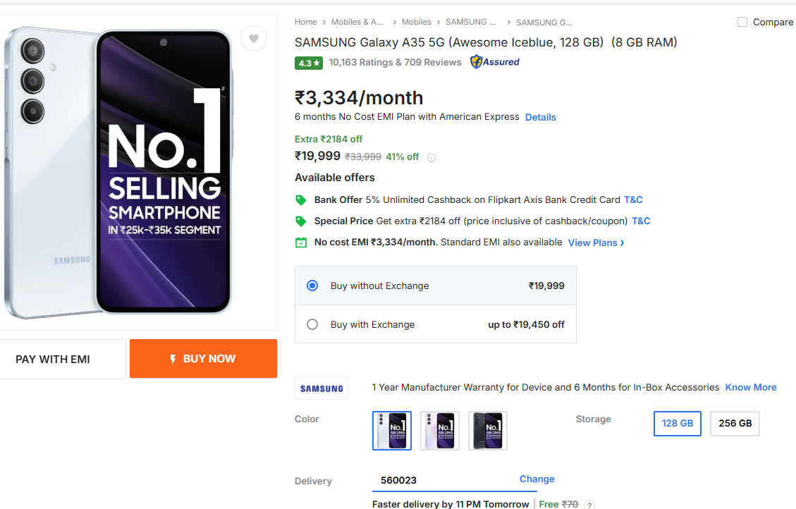 ಪ್ರಸ್ತುತ ಈ ಫೋನಿನ ಟಾಪ್-ಎಂಡ್ ರೂಪಾಂತರ ಅಂದರೆ 8GB RAM ಮತ್ತು 128GB ಸ್ಟೋರೇಜ್ ಸುಮಾರು 19,999 ರೂಗಳಿಗೆ ಪಟ್ಟಿ ಮಾಡಲಾಗಿದೆ. ಇದರ ಮತ್ತೊಂದು 8GB RAM ಮತ್ತು 256GB ಸ್ಟೋರೇಜ್ ಮಾದರಿಯ ಬೆಲೆ ಸುಮಾರು 21,999 ರೂಗಳಿಗೆ ಪಟ್ಟಿ ಮಾಡಲಾಗಿದೆ. ಅಲ್ಲದೆ Samsung Galaxy A35 5G ಸ್ಮಾರ್ಟ್ಫೋನ್‌ ಮೇಲೆ ಅಮೆಜಾನ್ ನಿಮಗೆ ಹೆಚ್ಚುವರಿಯಾಗಿ ವಿನಿಮಯ ಕೊಡುಗೆಯನ್ನು ಸಹ (Exchange Offer) ಪಡೆಯಬಹುದು.