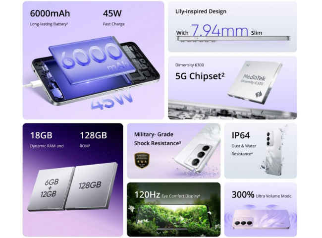 ಈ ಸ್ಮಾರ್ಟ್ ಫೋನ್ನ ಅತ್ಯುತ್ತಮ ವೈಶಿಷ್ಟ್ಯವೆಂದರೆ 45W ಫಾಸ್ಟ್ ಚಾರ್ಜಿಂಗ್ ಮತ್ತು 5W ರಿವರ್ಸ್ ಚಾರ್ಜಿಂಗ್ಗೆ ಬೆಂಬಲದೊಂದಿಗೆ 6,000mAh ಬ್ಯಾಟರಿಯನ್ನು ಪಡೆಯಬಹುದು. ಅಲ್ಲದೆ ಇದು ಧೂಳು ಮತ್ತು ನೀರಿನ ಪ್ರತಿರೋಧಕ್ಕಾಗಿ IP64 ರೇಟಿಂಗ್ನೊಂದಿಗೆ ಬರಲಿದ್ದು ಇಷ್ಟು ದೊಡ್ಡ ಬ್ಯಾಟರಿಯನ್ನು ಪ್ಯಾಕ್ ಮಾಡಲು ಅದರ ವಿಭಾಗದಲ್ಲಿ ಅತ್ಯಂತ ತೆಳ್ಳಗಿನ ಫೋನ್ ಎಂದು ಹೇಳಲಾಗುತ್ತದೆ. ಕೊನೆಯದಾಗಿ ಈ ಫೋನ್ ಲಿಲಿ ವೈಟ್, ಪರ್ಪಲ್ ಬ್ಲಾಸಮ್ ಮತ್ತು ಮಿಡ್ನೈಟ್ ಲಿಲಿ ಬಣ್ಣ ಆಯ್ಕೆಗಳಲ್ಲಿ ಲಭ್ಯವಾಗಬಹುದು.