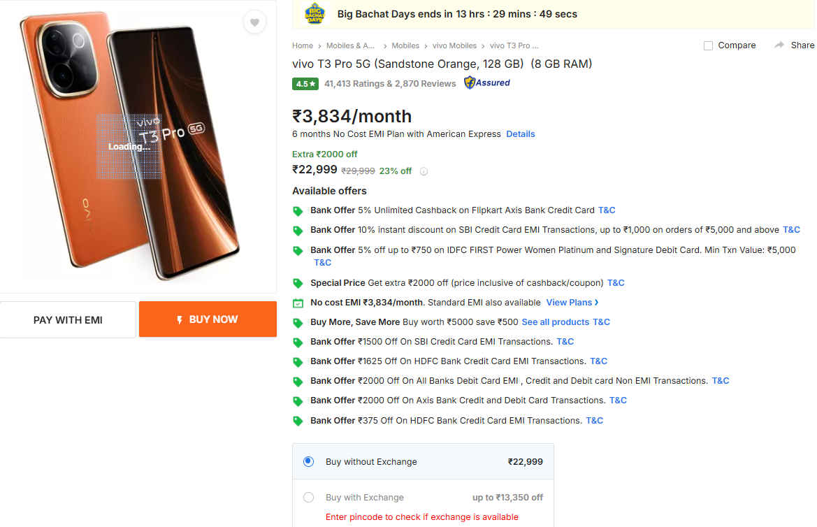 ಅಲ್ಲದೆ ನೀವು ಈ ಫೋನ್ ಮೇಲೆ ಅಮೆಜಾನ್ ಹೆಚ್ಚುವರಿಯಾಗಿ ವಿನಿಮಯ ಕೊಡುಗೆಯನ್ನು ಸಹ (Exchange Offer) ಪಡೆಯಬಹುದು. ಈ Vivo T3 Pro 5G ಸ್ಮಾರ್ಟ್ಫೋನ್ ಖರೀದಿಸಲು ನೀವು ನಿಮ್ಮ ಹಳೆಯ ಸ್ಮಾರ್ಟ್ಫೋನ್ ಇದರೊಂದಿಗೆ ವಿನಿಮಯ ಮಾಡುವುದರೊಂದಿಗೆ ಸುಮಾರು 13,350 ರೂಗಳ ವರೆಗೆ ಡಿಸ್ಕೌಂಟ್ ಪಡೆಯಬಹುದು. ಆದರೆ ಈ ಡೀಲ್ ಬೆಲೆಯನ್ನು ನಿಮ್ಮ ಹಳೆ ಫೋನಿನ ಸ್ಥಿತಿಯ ಮೇಲೆ ನಿರ್ಧರಿಸಲಾಗುತ್ತದೆ ಎಂಬುದನ್ನು ನೀವು ನೆನಪಿನಲ್ಲಿಡಿ.