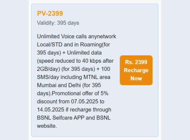 ಸರ್ಕಾರಿ ಸ್ವಾಮ್ಯದ ದೂರಸಂಪರ್ಕ ಸೇವಾ ಪೂರೈಕೆದಾರ ಬಿಎಸ್ಎನ್ಎಲ್ (BSNL) ಬರೋಬ್ಬರಿ 395 ದಿನಗಳ ದೀರ್ಘಾವಧಿಯ ಮಾನ್ಯತೆಯ ಅವಧಿಯೊಂದಿಗೆ ಆರ್ಥಿಕ ರೀಚಾರ್ಜ್ ಯೋಜನೆಯನ್ನು ಪ್ರಾರಂಭಿಸಿದೆ. ದೇಶದ ಸುಮಾರು 9 ಕೋಟಿಗೂ ಹೆಚ್ಚು ಬಳಕೆದಾರರನ್ನು ಗುರಿಯಾಗಿಟ್ಟುಕೊಂಡು BSNL ಈ ಹೊಸ ರೀಚಾರ್ಜ್ ಯೋಜನೆಯನ್ನು ಬರೋಬ್ಬರಿ 395 ದಿನಗಳ ವ್ಯಾಲಿಡಿಟಿಯೊಂದಿಗೆ 2,399 ರೂ.ಗಳ ಯೋಜನೆಯನ್ನು ನೀಡುತ್ತಿದೆ.