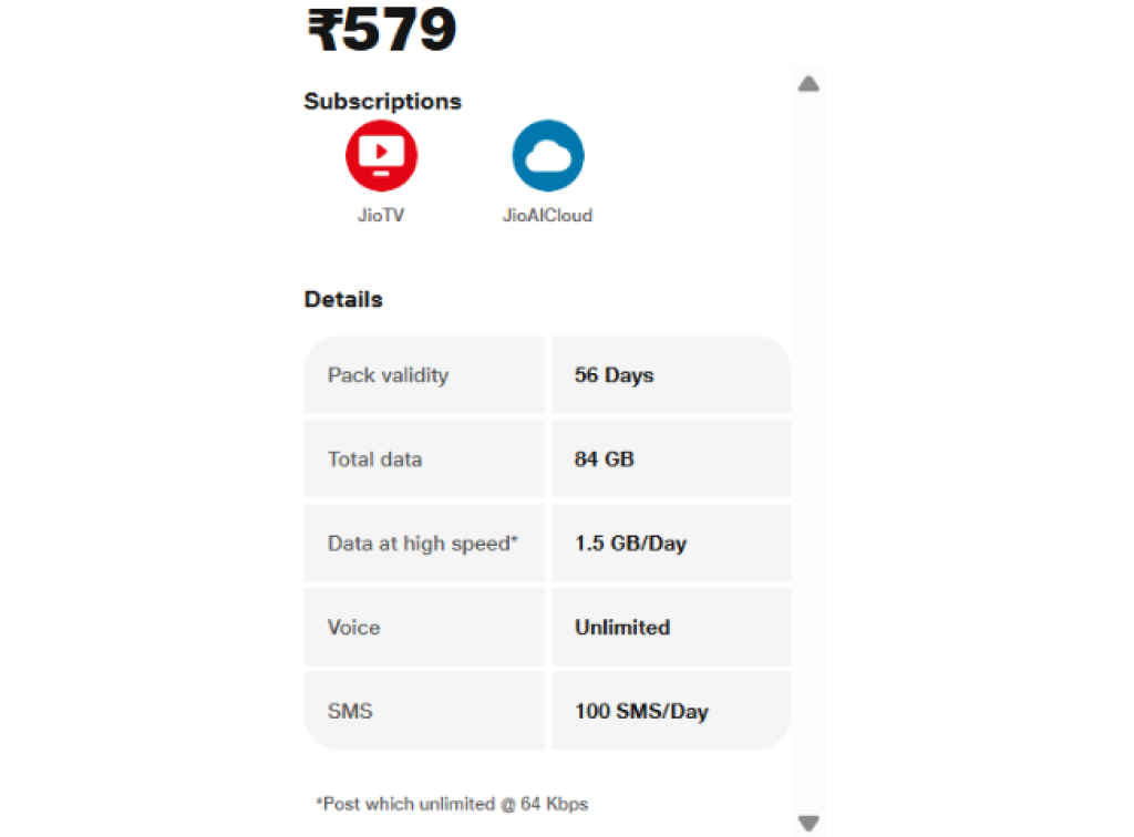 ಈ ರಿಲಯನ್ಸ್ ಜಿಯೋದ ₹579 ಪ್ಲಾನ್ನ ₹579 ಯೋಜನೆಯ ಪ್ರಮುಖ ಶಕ್ತಿ ಅದರ ಉದಾರ ಡೇಟಾ ಹಂಚಿಕೆ ಮತ್ತು ತಡೆರಹಿತ ಸಂಪರ್ಕದಲ್ಲಿದೆ. ಚಂದಾದಾರರು ದಿನಕ್ಕೆ 1.5GB ಹೈ-ಸ್ಪೀಡ್ 4G ಡೇಟಾವನ್ನು ಪಡೆಯುತ್ತಾರೆ ಇದು ಸಂಪೂರ್ಣ 56 ದಿನಗಳ ಅವಧಿಯಲ್ಲಿ ಒಟ್ಟು 84GB ಡೇಟಾವನ್ನು ಪಡೆಯುತ್ತದೆ.ಸಾಮಾಜಿಕ ಮಾಧ್ಯಮ ಬ್ರೌಸಿಂಗ್, ಸಂಗೀತ ಸ್ಟ್ರೀಮಿಂಗ್ ಮತ್ತು ವೀಡಿಯೊ ಕರೆಗಳಿಗೆ ಹಾಜರಾಗುವಂತಹ ದೈನಂದಿನ ಕಾರ್ಯಗಳಿಗೆ ಇದು ಸಾಕಾಗುತ್ತದೆ.