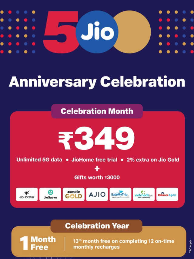 - ಪಾರ್ಟ್ನರ್ ಆಫರ್ಗಳು: ವಾರ್ಷಿಕೋತ್ಸವದ ಅಂಗವಾಗಿ ಗ್ರಾಹಕರು Amazon Prime, Disney+ Hotstar, ಮತ್ತು Zomato ನಂತಹ ಜಿಯೋ ಪಾರ್ಟ್ನರ್ಗಳ ಸೇವೆಗಳ ಮೇಲೆ ವಿಶೇಷ ರಿಯಾಯಿತಿಗಳನ್ನು ಪಡೆಯಬಹುದು.