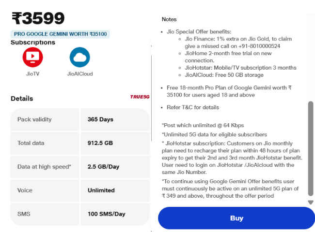 ಈ ಯೋಜನೆಯು ಪೂರ್ಣ ವರ್ಷದ ಮಾನ್ಯತೆಯನ್ನು ನೀಡುತ್ತದೆ. ಇದು 365 ದಿನಗಳವರೆಗೆ ಪ್ರತಿದಿನ 2.5GB ಡೇಟಾವನ್ನು ನೀಡುತ್ತದೆ. ಎಲ್ಲಾ ನೆಟ್ವರ್ಕ್ಗಳಿಗೆ ಅನಿಯಮಿತ ಧ್ವನಿ ಕರೆ, ದಿನಕ್ಕೆ 100 SMS ಜೊತೆಗೆ ಜಿಯೋ ವಿಶೇಷ ಕೊಡುಗೆಗಳು ಮತ್ತು 18 ತಿಂಗಳವರೆಗೆ Google Gemini Pro ಯೋಜನೆಗೆ ಉಚಿತ ಪ್ರವೇಶದಂತಹ ಪ್ರಯೋಜನಗಳೊಂದಿಗೆ ರೀಚಾರ್ಜ್ಗಳನ್ನು ಸಹ ಒದಗಿಸುತ್ತದೆ.