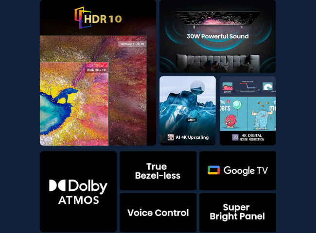 ಮೊದಲಿಗೆ ಈ ಸ್ಮಾರ್ಟ್ ಟಿವಿಯನ್ನು ಯಾಕೆ ಖರೀದಿಸುವುದು ಉತ್ತಮ ಮತ್ತು ಇದಕ್ಕೆ ಮುಖ್ಯ ಕಾರಣಗಳೇನು ಎಂದು ನೋಡುವುದಾದರೆ ಇದರಲ್ಲಿ ನಿಮಗೆ ದೊಡ್ಡ 65 ಇಂಚಿನ ಸ್ಕ್ರೀನ್ ಜೊತೆಗೆ ಬರುತ್ತದೆ. ಈ ಬೆಲೆಗೆ ತುಂಬ ಕಡಿಮೆ ಆಯ್ಕೆಗಳು ಮಾತ್ರ ಮಾರುಕಟ್ಟೆಯಲ್ಲಿ ಲಭ್ಯವಿದೆ ಅಂದರೆ ಕಡಿಮೆ ಬೆಲೆಯಲ್ಲಿ ಉತ್ತಮ ಫೀಚರ್ಳೊಂದಿಗೆ ನೀಡಲಾಗಿದೆ. ಇದರಲ್ಲಿ 4K ಅಲ್ಟ್ರಾ HD ಸ್ಕ್ರೀನ್ ಅತ್ಯಂತ ಸ್ಪಷ್ಟವಾದ ಮತ್ತು ಪ್ರಕಾಶಮಾನವಾದ ಚಿತ್ರಗಳನ್ನು ತೋರಿಸುತ್ತದೆ. ಅಲ್ಲದೆ Dolby Atmos ಸೌಂಡ್ ಸಿಸ್ಟಮ್ ಬರೋಬ್ಬರಿ 30W ಸ್ಪೀಕರ್ಗಳ ಮೂಲಕ ಉತ್ತಮ ಧ್ವನಿಗಾಗಿ ಇರಿಸಲಾಗಿದೆ.