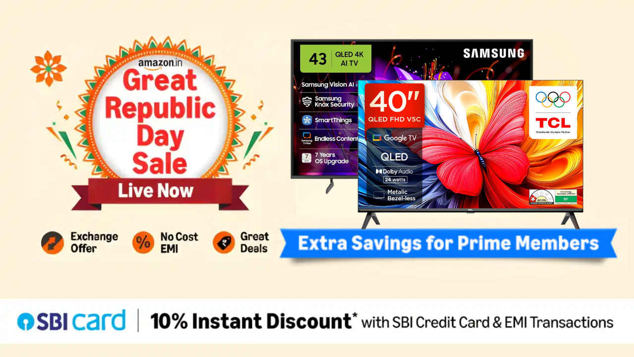 4K Smart TVs: ಭಾರತದಲ್ಲಿ ಪ್ರಸ್ತುತ ನಡೆಯುತ್ತಿರುವ ವರ್ಷದ ಅತಿದೊಡ್ಡ ಅಮೆಜಾನ್ ಗ್ರೇಟ್ ರಿಪಬ್ಲಿಕ್ ಡೇ ಸೇಲ್ (Amazon Great Republic Day Sale 2026) ಅಧಿಕೃತವಾಗಿ ಆರಂಭವಾಗಿದ್ದು ಎಲ್ಲಾ ವಿಭಾಗಗಳಲ್ಲಿ ಭಾರಿ ರಿಯಾಯಿತಿಗಳನ್ನು ತರುತ್ತಿದೆ. ಈಗ ಪ್ರೈಮ್ ಸದಸ್ಯರು ಪ್ರಸ್ತುತ ಸಾರ್ವಜನಿಕರ ಮುಂದೆ ಅತ್ಯುತ್ತಮ ಡೀಲ್ಗಳಿಗೆ ವಿಶೇಷ ಆರಂಭಿಕ ಪ್ರವೇಶವನ್ನು ಆನಂದಿಸುತ್ತಿದ್ದಾರೆ. ಡೀಲ್ಗಳನ್ನು ಇನ್ನಷ್ಟು ಸಿಹಿಗೊಳಿಸಲು ಅಮೆಜಾನ್ SBI ಜೊತೆ ಪಾಲುದಾರಿಕೆ ಹೊಂದಿದ್ದು SBI ಕ್ರೆಡಿಟ್ ಕಾರ್ಡ್ಗಳು ಮತ್ತು EMI ವಹಿವಾಟುಗಳನ್ನು ಬಳಸುವ ಗ್ರಾಹಕರಿಗೆ ತ್ವರಿತ 10% ರಿಯಾಯಿತಿಯನ್ನು ನೀಡುತ್ತದೆ. ಇದು ಋತುವಿನ ಅತ್ಯಂತ ಕಡಿಮೆ ಬೆಲೆಗಳನ್ನು ಖಚಿತಪಡಿಸುತ್ತದೆ.