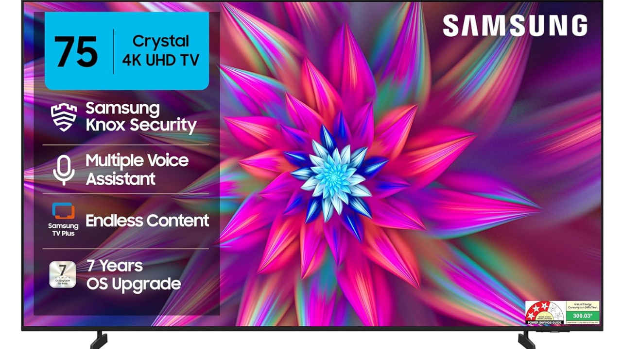 Samsung ಸಂಸ್ಥೆಯ ಈ ಸ್ಮಾರ್ಟ್ಟಿವಿಯು 75 ಇಂಚಿನ (189 cm) ಕ್ರಿಸ್ಟಲ್ 4K ಅಲ್ಟ್ರಾ HD ಸ್ಕ್ರೀನ್ ಅನ್ನು ಪಡೆದಿದೆ. ಈ ಟಿವಿ ಸ್ಕ್ರೀನ್ 3840 x 2160 ಪಿಕ್ಸಲ್ ರೆಸಲ್ಯೂಶನ್ ಜೊತೆಗೆ 4K Ultra HD ಸಪೋರ್ಟ್ ಹೊಂದಿದೆ. ಹಾಗೆಯೇ ಇದು HDR10+ ಸಪೋರ್ಟ್, 4K ಅಪ್ಸ್ಕೇಲಿಂಗ್, ಫಿಲ್ಮ್ಮೇಕರ್ ಮೋಡ್ ಗಳಂತಹ ಆಯ್ಕೆಗಳನ್ನು ಒಳಗೊಂಡಿದೆ. ಈ ಸ್ಮಾರ್ಟ್ ಟಿವಿಯು Samsung Tizen ಓಎಸ್ ಪ್ರೊಸೆಸರ್ ಸೌಲಭ್ಯ ಒಳಗೊಂಡಿದೆ ಹಾಗೂ IoT ಸೆನ್ಸರ್ ಬೆಂಬಲ, ಮೊಬೈಲ್ ಟು ಟಿವಿ ಮಿರರಿಂಗ್, ಸೌಂಡ್ ಮಿರರಿಂಗ್, ಸ್ಮಾರ್ಟ್ಥಿಂಗ್ಸ್ ಹಬ್ಸ್ ಸೌಲಭ್ಯಗಳನ್ನು ಪಡೆದುಕೊಂಡಿದೆ. ಸ್ಥಿರ ವೈರ್ಡ್ ಇಂಟರ್ನೆಟ್ಗಾಗಿ ಈಥರ್ನೆಟ್ LAN ಪೋರ್ಟ್ ಜೊತೆಗೆ Wi-Fi 5, ಬ್ಲೂಟೂತ್ 5.2, ಮತ್ತು HDMI eARC ಆಯ್ಕೆಗಳನ್ನು ಪಡೆದಿದೆ.