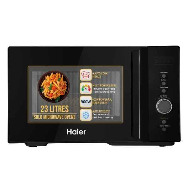 Haier 23L Solo Microwave Oven with Defrost Technology, Child Lock (HIL2301MBEJ, Black, Inbuilt Auto Cook Menus)