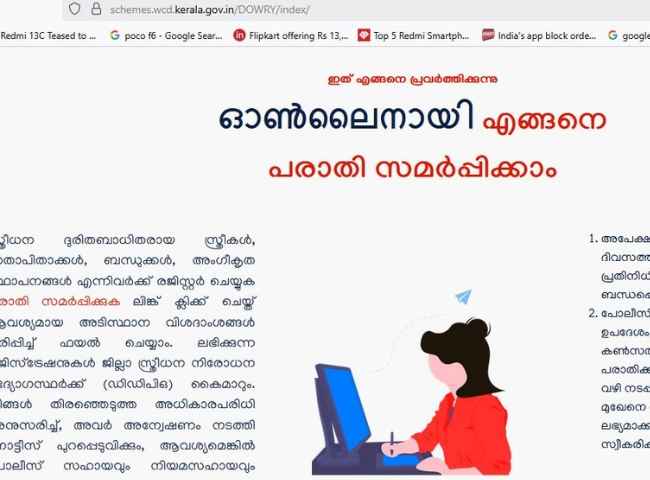 https://schemes.wcd.kerala.gov.in/DOWRY/index/ എന്ന വെബ്സൈറ്റിലൂടെയാണ് പരാതി സമർപ്പിക്കേണ്ടത്.