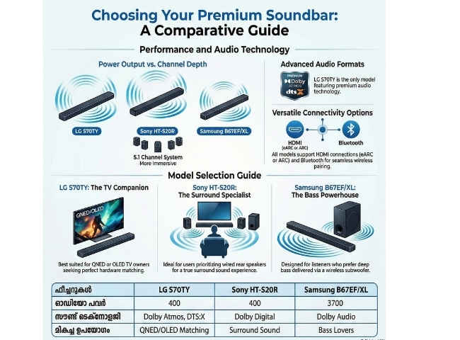 LG S70TY 400W 3.1.1 Channel മോഡലിൽ വരുന്ന സൗണ്ട്ബാർ ആണിത്. പവർഫുൾ പെർഫോമൻസും കോംപാക്റ്റ് ഡിസൈനുമാണ് സൌണ്ട്ബാറിന്റെ ഹൈലൈറ്റ്. ഡോൾബി അറ്റ്മോസ് സപ്പോർട്ടുള്ള ഹോം തിയേറ്റർ യൂണിറ്റ് നോക്കുന്നവർക്ക് ഇത് ഇണങ്ങും. എൽജിയുടെ വിപണിയിൽ ഡിമാൻഡ് കൂടുതലുള്ള ക്യുഎൻഇഡി ടിവികളുമായി വേഗത്തിൽ കണക്റ്റിവിറ്റിയും ലഭിക്കുന്നു.