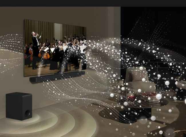 ഇടത്, വലത്, മധ്യഭാഗങ്ങളിൽ നിന്നുള്ള ഓഡിയോ ഫയറിംഗ് ഉപയോഗിച്ച് പ്രീമിയം ലിസണിംഗ് അനുഭവം ലഭിക്കും. ഇതിൽ സറൗണ്ട് സൗണ്ട് അനുഭവം ലഭിക്കും. ഇത് മുറിയുടെ എല്ലാ കോണിലേക്കും ശബ്ദം എത്തിക്കും. ഇതിനായി എൽജി അപ്ഫയറിംഗ് സ്പീക്കറുകൾ കൊടുത്തിരിക്കുന്നു.