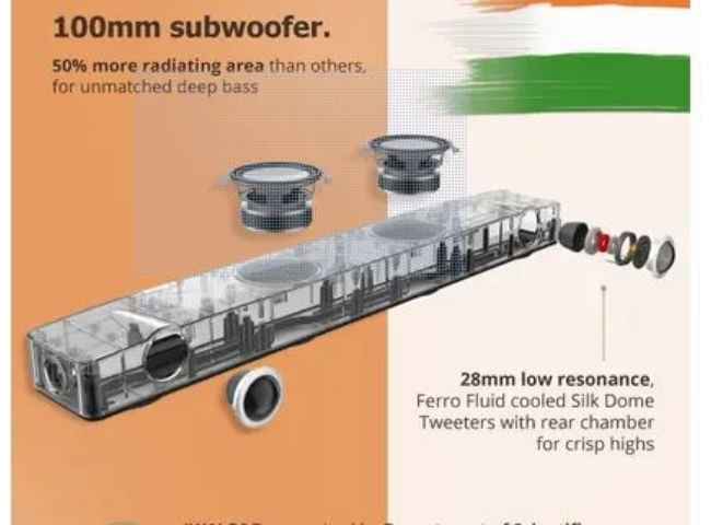 സൗണ്ട്ബാറിൽ രണ്ട് 100mm സബ് വൂഫറുകൾ ഉൾപ്പെടുത്തിയിരിക്കുന്നു. ആക്ഷൻ സിനിമകളും മ്യൂസിക്കും മെച്ചപ്പെടുത്തുന്ന ആഴത്തിലുള്ള ബാസ് ഇതിന് ലഭിക്കുന്നു. സിനിമാറ്റിക് ഓഡിയോ എക്സ്പീരിയൻസ് ലഭിക്കുന്നതിനായി ഉയർന്ന പവർ ഔട്ട്പുട്ട് ഇതിലുണ്ട്. വലിയ ലിവിംഗ് റൂമുകൾക്ക് അനുയോജ്യമായ സൌണ്ട് സിസ്റ്റമാണിത്.