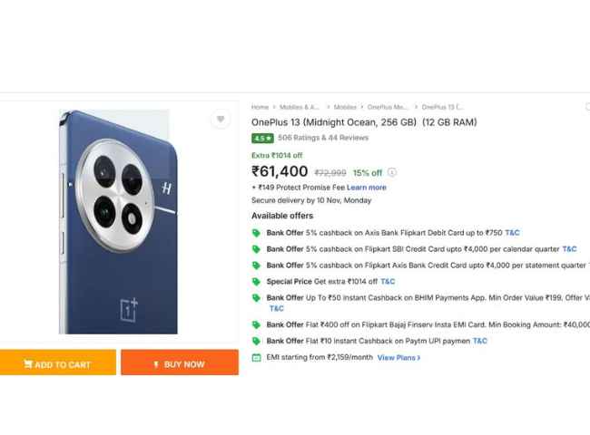 ഫ്ലിപ്കാർട്ടിലാണ് വൺപ്ലസ് 13 5ജി ഫോണിനാണ് ഇളവ്. 12 ജിബി റാമും 256 ജിബി വേരിയന്റുമുള്ള വൺപ്ലസ് 13 ഫോൺ 62000 രൂപയ്ക്ക് താഴെ വാങ്ങാം. 72,999 രൂപയ്ക്ക് പുറത്തിറക്കിയ ഫോണാണിത്. എന്നാൽ വൺപ്ലസ് 15 ലോഞ്ച് പ്രമാണിച്ച് ഈ ഹാൻഡ്സെറ്റ് കുറഞ്ഞ വിലയ്ക്ക് വിറ്റഴിക്കുകയാണ്.