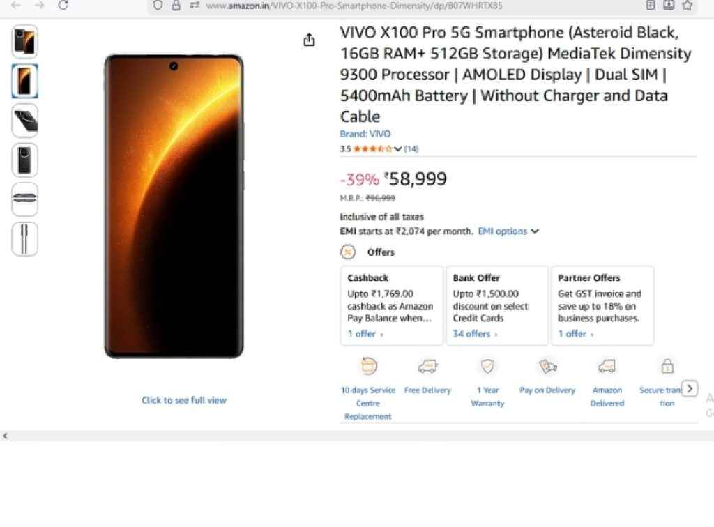 96,999 രൂപയാണ് വിവോ എക്സ്100 പ്രോയുടെ ഒറിജിനൽ വില. ആമസോൺ ഇതിന് 39 ശതമാനം ഇളവ് പ്രഖ്യാപിച്ചു. എന്നുവച്ചാൽ ഫ്ലിപ്കാർട്ടിൽ പോലും ഈ ഫോൺ 77990 രൂപയ്ക്കാണ് വിൽക്കുന്നത്. എന്നാൽ ആമസോണിൽ ഹാൻഡ്സെറ്റ് 38000 രൂപ വിലക്കുറവിൽ ലഭിക്കും. എന്നുവച്ചാൽ വിവോ എക്സ്100 പ്രോ 58,999 രൂപയ്ക്ക് വാങ്ങിക്കാം.
