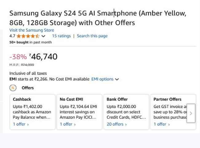 46,740 രൂപയ്ക്കാണ് ഫോൺ ആമസോണിൽ ലിസ്റ്റ് ചെയ്തിട്ടുള്ളത്. ഇതിന് പുറമെ മികച്ച ബാങ്ക് ഓഫറുകളും, ഇഎംഐ ഡീലുകളുംം ആമസോൺ നൽകുന്നു. HDFC ബാങ്ക് കാർഡുകളും മറ്റും ഉപയോഗിച്ചാണ് പേയ്മെന്റെങ്കിൽ, 2000 രൂപ വരെ ഇളവ് സ്വന്തമാക്കാം. ഇങ്ങനെ സാംസങ് എസ്24 ഫോൺ 44,740 രൂപയ്ക്ക് വരെ വാങ്ങാനാകും. 2,266 രൂപയുടെ ഇഎംഐ ഇളവും, 2,104 രൂപയുടെ നോ-കോസ്റ്റ് ഇഎംഐ ഓഫറും ലഭിക്കുന്നതാണ്. പഴയ ഫോൺ മാറ്റി വാങ്ങുന്നവർക്ക് 44,050 രൂപയ്ക്ക് എക്സ്ചേഞ്ച് ഓഫറായും ഫോൺ നേടാം.