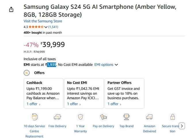 ഇത്രയും വലിയ ഓഫറായതിനാൽ തന്നെ ഗാലക്സി എസ്24 5ജിയ്ക്ക് നിലവിൽ ബാങ്ക് ഡിസ്കൌണ്ടൊന്നും നൽകുന്നില്ല. എന്നാൽ വളരെ മികച്ച എക്സ്ചേഞ്ച് ഡീൽ ആമസോണിൽ നിന്ന് നേടാം. 37,600 രൂപയുടെ എക്സ്ചേഞ്ച് ഓഫർ ലഭ്യമാണ്. 1,939 രൂപയുടെ ഇഎംഐ ഡീലും ആമസോൺ വാഗ്ദാനം ചെയ്യുന്നു.