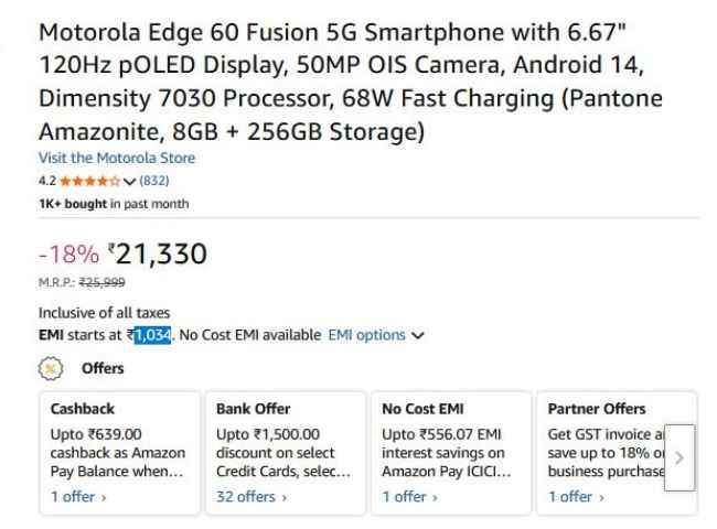 256 ജിബി സ്റ്റോറേജുള്ള മോട്ടറോള ഹാൻഡ്സെറ്റ് നിങ്ങൾക്ക് വെറും 21,330 രൂപയ്ക്ക് വാങ്ങാം. ഇത് ആമസോണിലെ പരിമിതകാല ഡീലാണ്. 1500 രൂപയുടെ ബാങ്ക് ഡിസ്കൌണ്ടും ലഭ്യമാണ്. ഇങ്ങനെ മോട്ടോ എഡ്ജ് 60 ഫ്യൂഷൻ 20000 രൂപയിലേക്ക് എത്തുന്നു.