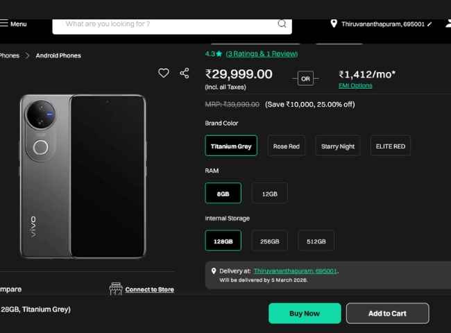 128ജിബി സ്റ്റോറേജും 8ജിബി റാമുമുള്ള ഫോണാണിത്. 29,999 രൂപയ്ക്കാണ് സ്മാർട്ട്ഫോൺ ക്രോമയിൽ വിൽക്കുന്നത്. ഒറിജിനൽ വിലയിൽ നിന്ന് 10000 രൂപയുടെ ഇളവാണ് ഇങ്ങനെ ലഭിക്കുന്നത്. മറ്റ് പല പ്ലാറ്റ്ഫോമുകളിലും 32000 രൂപയ്ക്ക് മുകളിൽ വിലയാകുന്ന ഹാൻഡ്സെറ്റാണിത്. വിവോ വി50 5ജി 1,412 രൂപയുടെ ഇഎംഐ ഡീലിലും വിൽക്കുന്നു.