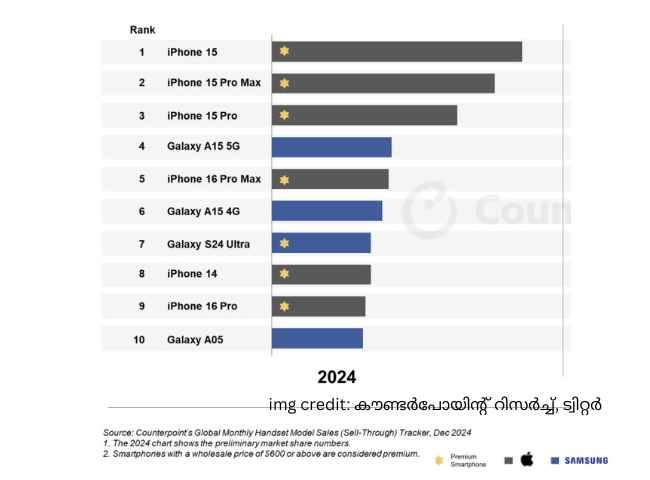 2024-ൽ ഏറ്റവും കൂടുതൽ വിറ്റഴിച്ച സ്മാർട്ഫോൺ Samsung Galaxy S24 Ultra അല്ല. Best Selling സ്മാർട്ഫോണുകളുടെ ആദ്യ മൂന്ന് സ്ഥാനവും ഒറ്റ കമ്പനി കൊണ്ടുപോയി. എന്നാലും ആദ്യ 10 ഫോണുകളുടെ ലിസ്റ്റിൽ സാംസങ്ങിന്റെ 2024-ലെ ഫ്ലാഗ്ഷിപ്പ് ഇടംപിടിച്ചിട്ടുണ്ട്.