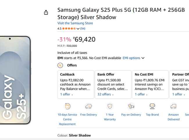 സാംസങ് എസ്25 പ്ലസ്സിന് ബാങ്ക് ഓഫറുകളും എക്സ്ചേഞ്ച് ബോണസും ലഭ്യമാണ്. എങ്കിലും ഇവയൊന്നും ചേർക്കാതെ 70000 രൂപയ്ക്കും താഴേക്ക് വില വീണു. സിൽവർ ഷാഡോയിലുള്ള സാംസങ് ഫോണിന്റെ ആമസോണിലെ വില 69,420 രൂപയാണ്. സ്റ്റോക്ക് തീരുന്നതിന് അനുസരിച്ച് ഓഫറിലും വ്യത്യാസം വന്നേക്കാം.