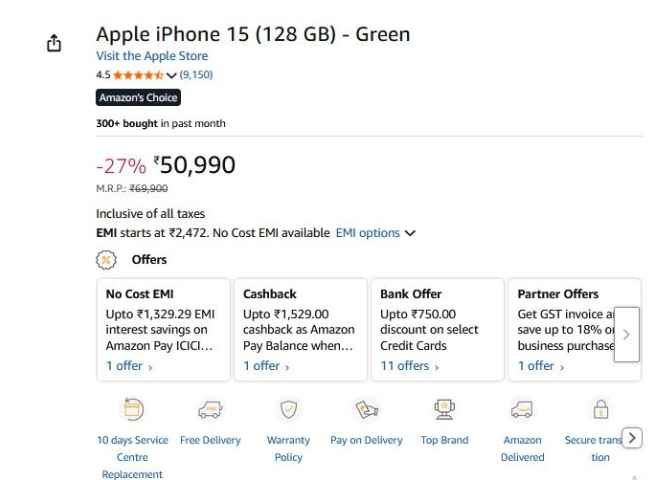 HDFC ബാങ്ക് കാർഡുകളിലൂടെ 750 രൂപയുടെ കിഴിവും ലഭ്യമാണ്. ഇനി ഐഫോൺ 15 എക്സ്ചേഞ്ചിൽ വാങ്ങാനാണ് ആഗ്രഹിക്കുന്നതെങ്കിൽ 47,350 രൂപയ്ക്കും വാങ്ങാം. 2,472 രൂപയുടെ ഇഎംഐ ഡീലും ആമസോണിൽ നിന്ന് നേടാം. ഐഫോൺ 15 നിങ്ങൾക്ക് 1,329.29 രൂപയുടെ നോ കോസ്റ്റ് ഇഎംഐയിലും ആമസോണിൽ നിന്ന് ലഭ്യം.