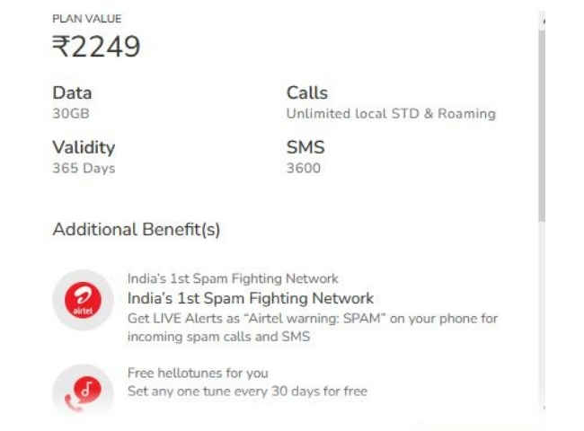30GB ഹൈ-സ്പീഡ് ഡാറ്റ ഈ എയർടെൽ പ്ലാനിൽ നിന്ന് നേടാം. ഇതിൽ സ്വകാര്യ കമ്പനി സൗജന്യ ഹലോ ട്യൂൺസ്, സൗജന്യ ദേശീയ റോമിംഗ് സേവനങ്ങളും നൽകുന്നു,