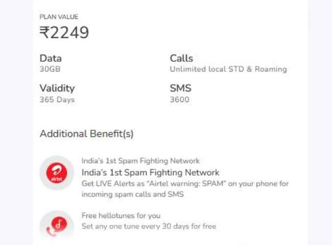 Airtel 2249 plan: ആനുകൂല്യങ്ങൾ