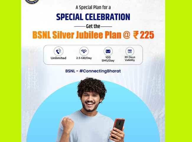 ഭാരത് സഞ്ചാർ നിഗം ലിമിറ്റഡ് 25 വർഷം പൂർത്തിയാക്കി. സിൽവർ ജൂബിലി പ്രമാണിച്ച് പുതിയതായി BSNL പുതിയ പ്ലാനും അവതരിപ്പിച്ചു. 250 രൂപയിലും താഴെ മാത്രം വിലയാകുന്ന പ്ലാനാണിത്. ബജറ്റ് അവബോധമുള്ള വരിക്കാരെ ആകർഷിക്കാനുള്ള പ്രീ പെയ്ഡ് പാക്കേജാണിത്. 25 വർഷം പൂർത്തിയാക്കുന്ന വേളയിൽ ടെലികോം കമ്പനി സ്വദേശി 4ജിയിലൂടെ കണക്റ്റിവിറ്റി ശക്തമാക്കി.