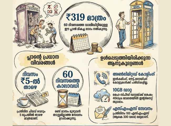 അതേ സമയം ജിയോ, എയർടെലിൽ 28 ദിവസ പ്ലാനുകൾക്ക് തന്നെ 200 മുതൽ 300 രൂപ വരെയാകുന്നു. ബിഎസ്എൻഎൽ സെക്കൻഡറി സിമ്മായി ഉപയോഗിക്കുന്നവർക്ക് 319 രൂപ പ്ലാൻ മികച്ചതാണ്. പ്രതിദിന ഡാറ്റ പരിധിയില്ല എന്നതാണ് പ്ലാനിലെ മറ്റൊരു സവിശേഷത. കേരളം ഉൾപ്പെടെയുള്ള മിക്ക സർക്കിളുകളിലും സർക്കാർ ടെലികോമിന്റെ ബജറ്റ് പ്ലാൻ ലഭ്യമാണ്.