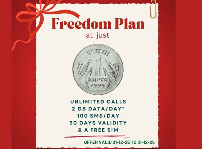 4ജി കണക്ഷനും പരിധിയില്ലാതെ വോയിസ് കോളുകളും തരുന്ന പാക്കേജാണിത്. ബിഎസ്എൻഎൽ കൂടുതൽ വരിക്കാരെ ആകർഷിക്കാനും പ്ലാൻ സഹായിച്ചു. ഇപ്പോൾ വർഷാവസാനം പൊതുമേഖല ടെലികോം വീണ്ടും 1 Rupee Freedom Plan പുറത്തിറക്കി.