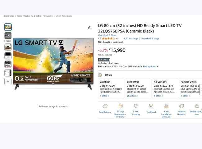 23000 രൂപയാണ് ഈ എൽജി സ്മാർട് ടിവിയ്ക്ക് വിലയാകുന്നത്. 15,990 രൂപയ്ക്ക് ആമസോണിൽ ഇപ്പോൾ ടിവി ലഭിക്കും. ഇതിന് പുറമെ 479 രൂപയുടെ ക്യാഷ്ബാക്കും, 1500 രൂപയുടെ ബാങ്ക് ഡിസ്കൌണ്ടും ആമസോൺ തരുന്നു. ഇഎംഐയിൽ വാങ്ങുകയാണെങ്കിൽ മാസപ്പലിശയില്ലാതെ, 720 രൂപയ്ക്ക് സ്വന്തമാക്കാം.