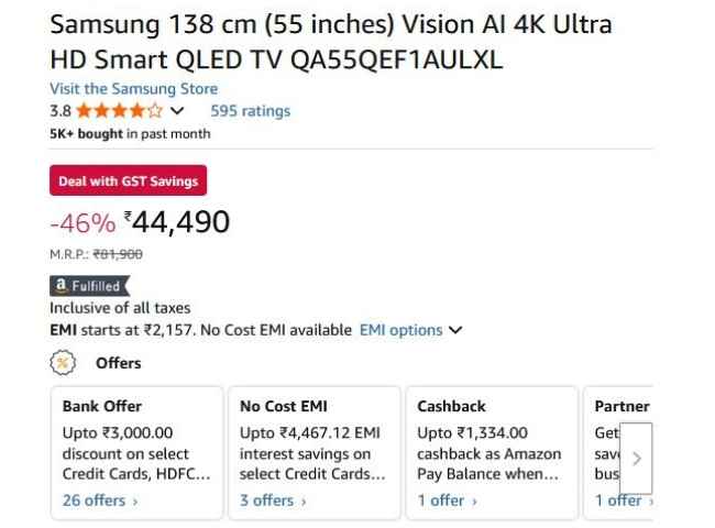 എന്നാൽ ആമസോൺ സാംസങ് സ്മാർട് ടിവി വിൽക്കുന്നത് വെറും 44,490 രൂപയ്ക്കാണ്. ഇവിടെ കൊണ്ട് ഓഫർ അവസാനിക്കുന്നില്ല. ഇതിന് എച്ച്ഡിഎഫ്സി കാർഡുകളിലൂടെ 3000 രൂപ വരെ കിഴിവ് നേടാം. 2,157 രൂപയുടെ ഇഎംഐ ഡീലും ആമസോൺ തരുന്നു.