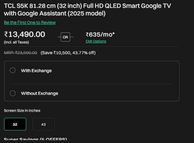 വീട്ടിലേക്ക് പുത്തൻ സ്മാർട് ടിവി നോക്കുകയാണോ? ഈ ദീപാവലിയ്ക്ക് തന്നെ മികച്ച ഡിസ്പ്ലേ ടെലിവിഷൻ സ്വന്തമാക്കാം. അതും ഒരു സ്മാർട്ഫോണിന്റെ വിലയിൽ നിങ്ങൾക്ക് ടിവി വാങ്ങാനാകും. TCL S5K 32 ഇഞ്ച് വലിപ്പമുള്ള Best QLED TV-യ്ക്കാണ് കിഴിവ്. ഫുൾ എച്ച്ഡി ക്യുഎൽഇഡി സ്മാർട് ഗൂഗിൾ ടിവിയാണിത്. TATA ഇ-കൊമേഴ്സ് പ്ലാറ്റ്ഫോമിലാണ് വിലക്കിഴിവ്.