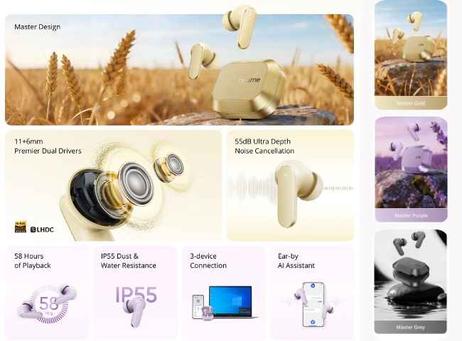 അനുയോജ്യമായ ഫോണുകളിലും ആപ്പുകളിലും ഉയർന്ന ബിറ്റ്റേറ്റ് സ്ട്രീമിംഗിനായി LHDC 5.0 കോഡെക്കുണ്ട്. ഇതിൽ റിയൽമി ഡ്യുവൽ DAC ചിപ്പുകളും N52 മാഗ്നറ്റുകളും കൂടാതെ ഡയഫ്രവും നൽകിയിരിക്കുന്നു.