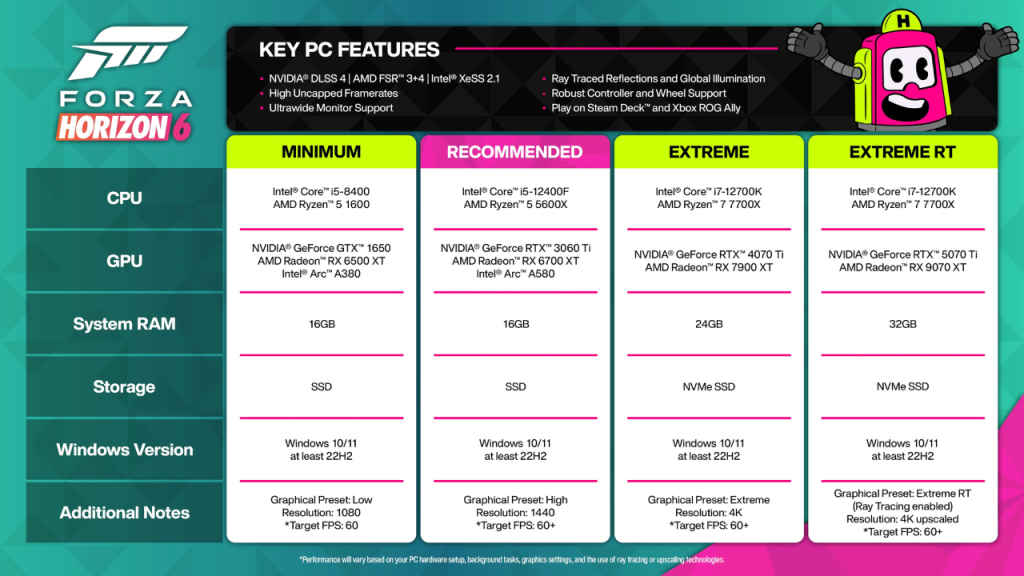 Playground Games has shared a detailed chart on what all you need to run the game. At the lowest settings, the game will run on Nvidia Geforce 1650Ti/AMD Radeon RA 6500 XT/Intel Arc A380 GPU and an Intel Core i5-8400 or AMD Ryzen 5 1600 processor. With this, you will need 16GB RAM, SSD storage, and Windows 10 or 11.