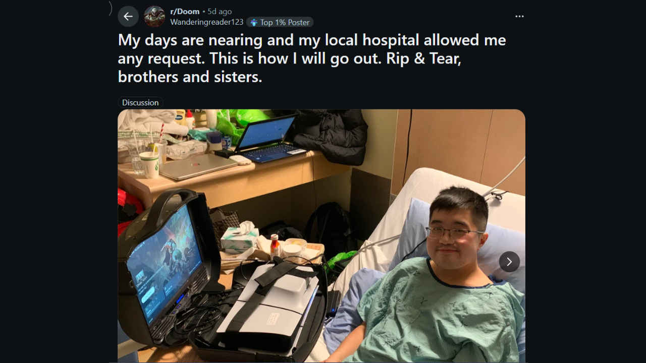 The story surfaced on Reddit’s Doom community, where a user known as u/Wanderingreader123 shared a deeply personal update. The gamer revealed that he has been battling cancer since 2022 and had recently been told that his time was limited. While undergoing treatment at a hospital in Toronto, Canada, he made a simple request. He wanted to play Doom one last time.