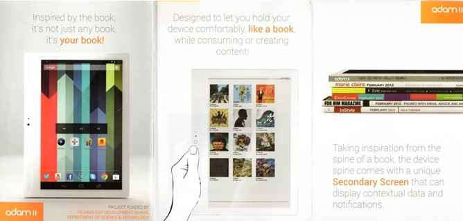 SurveyThe Adam II is said to feature dual-screens. The first screen is the normal IPS display with 1280×800 pixels resolution, the other one is located on the spine of the tablet. The second screen is a Super-twisted nematic display (STN) that shows notifications as well as contextual data related to what showing on the main display.