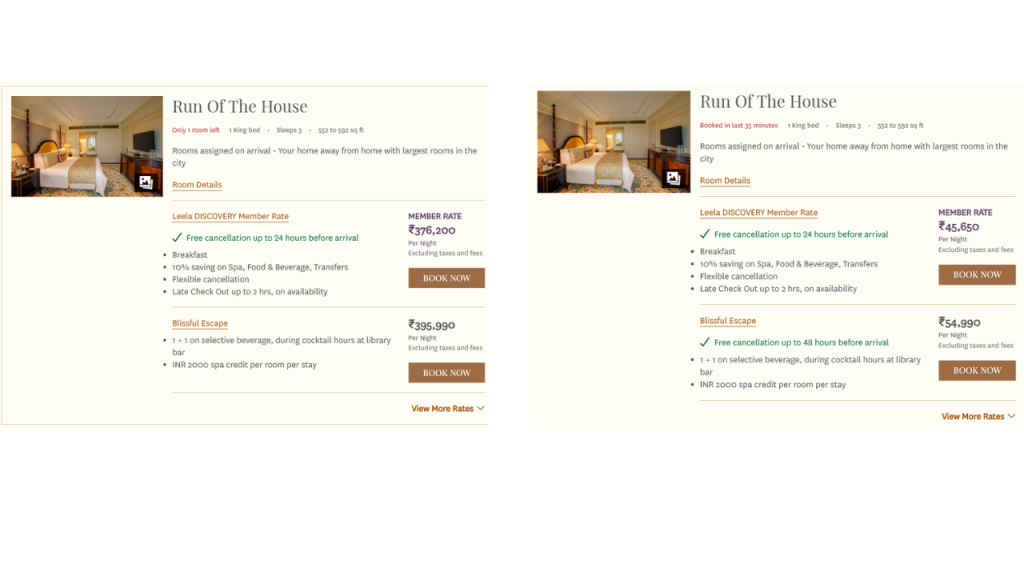 At The Leela Palace, New Delhi, we found that a one-night stay on February 17 for a ‘Run of the House’ room is priced at Rs 3,95,990. When we checked the same room for March 17, it was listed for Rs 54,990 per night.