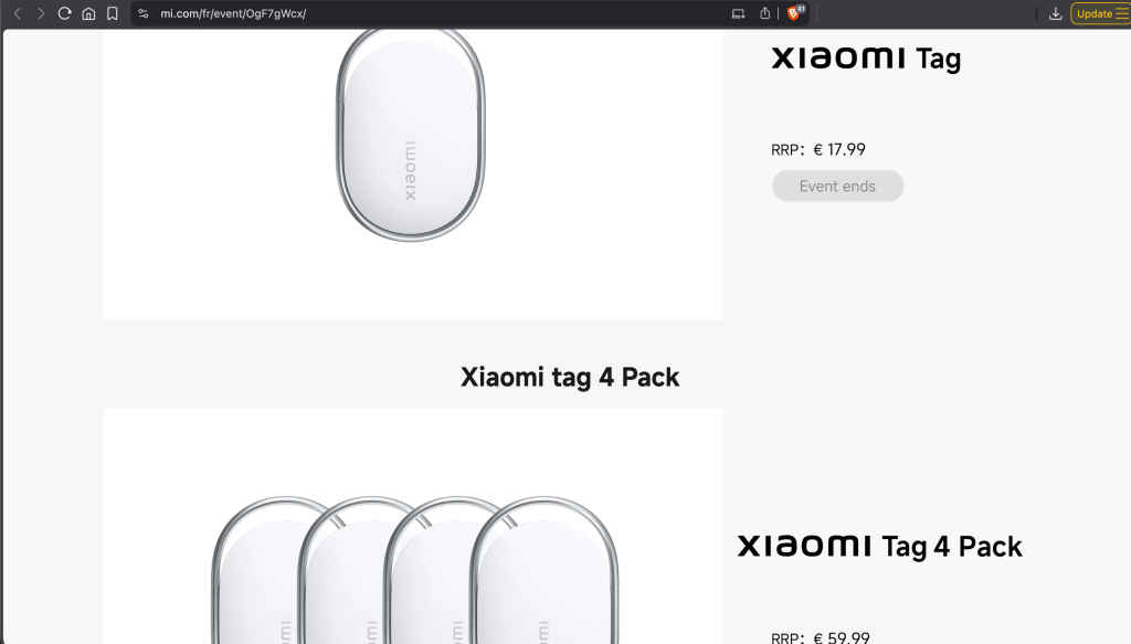A single Xiaomi Tag is listed on Xiaomi France’s website for 17.99 euros (about Rs 1,933) and a pack of 4 for 59.99 euros (about Rs 6,445).