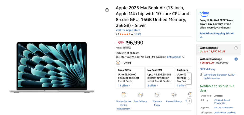 The MacBook Air powered by Apple’s M4 chip comes with an MRP of Rs 99,900. This is the 13-inch variant we are talking about. But for now, the laptop is being sold for Rs 96,990 without any other offers. Now, it is possible to reduce this price more and get the laptop’s final price under Rs 85,000. How, you ask? Well, you just need an eligible credit card, and an old laptop.