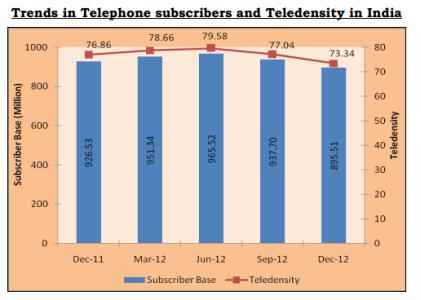 This reflects year-on-year (Y-O-Y) negative growth of 3.35% over the same quarter of last year. The overall Tele-density in India has declined from 77.04 as on 30th September, 2012 to 73.34 as on 31st December, 2012, reports the note.