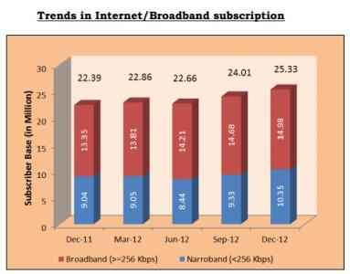 According to the report, Internet subscribers increased from 24.01 million at the end of Sep-12 to 25.33 million at the end of Dec-12, registering a quarterly growth rate of 5.49%. Top 10 ISPs together hold 95.42% of the total Internet subscriber base.