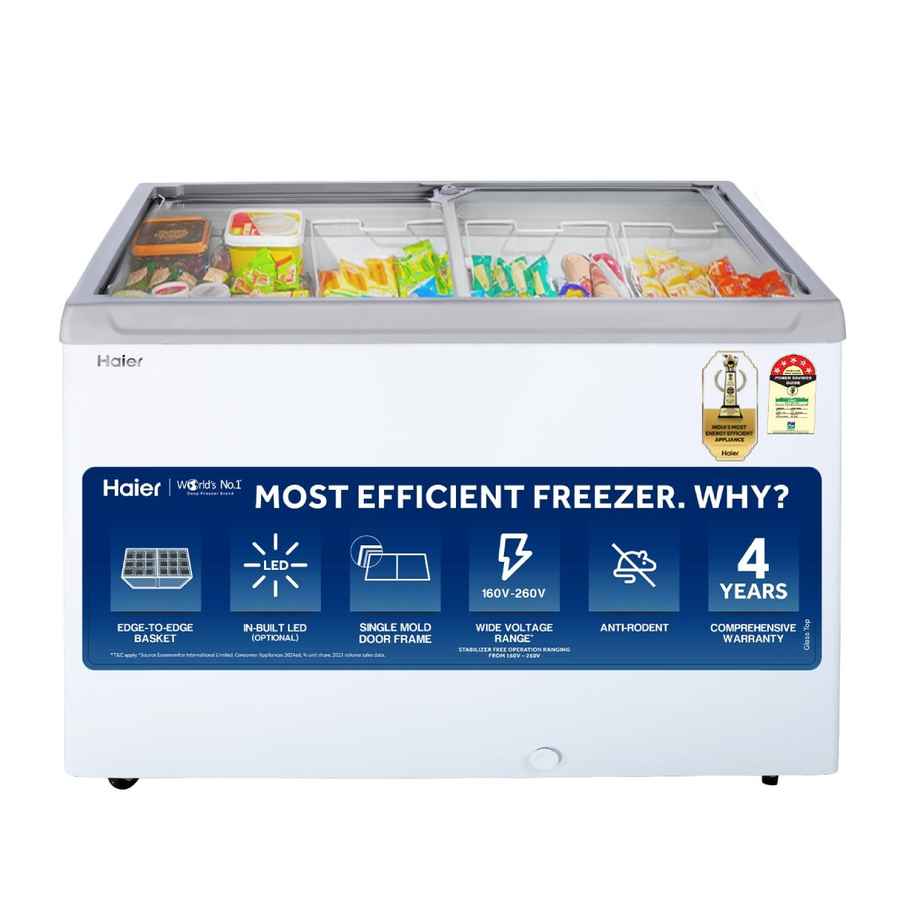 Haier HFC-300GM5, 5-Star Rated Glass Top Freezer, Single Mould, Anti-Rodent, Integrated Lock, with metal Liner inside and 4 Years Comprehensive Warranty (White)