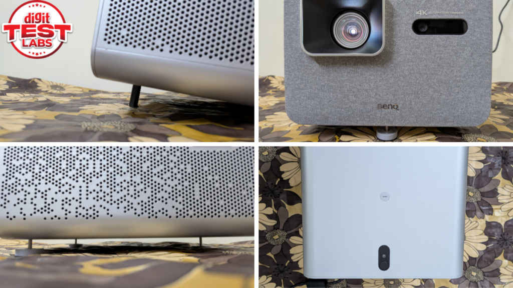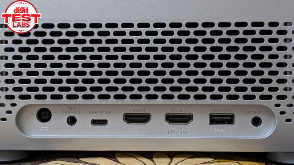 On the back of the device, below the grille, there is a small cavity, where all of its ports are situated. You get the power port, 12V trigger, two HDMI 2.1 ports (one of which supports eARC 7.1 channel for soundbar), a 3.5mm audio output jack, USB-A 2.0 port for media sticks, and a USB-C (DP/PD charging at 30W) port. You can connect a laptop or handheld console like Nintendo Switch through this port for both display and charging purposes.