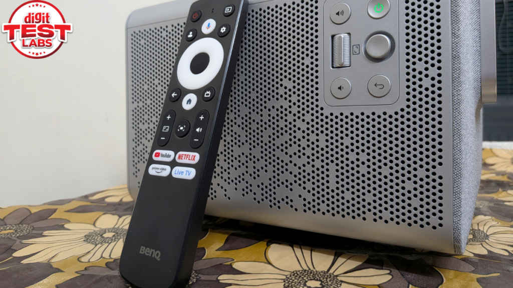 Prop it opposite a vacant wall or screen, connect it to a power source and use the remote to turn it on and manage the rest of the controls. The light and slim black controller resembles TV remotes. It has the buttons to control the projection’s zoom, orientation, volume, and navigation. You also get Google Assistant and hotkeys for streaming platforms like Netflix, YouTube, Prime Video and Live TV. BenQ also allows remote control via a smartphone app. More on that later.